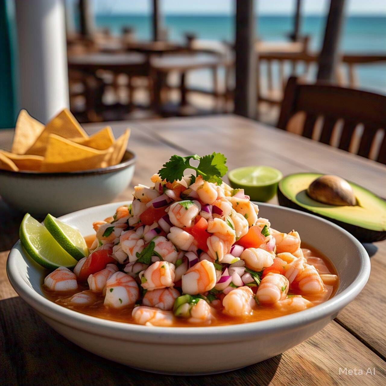 Delicioso ceviche de camarón, tostadas, totopos, aderezo, salsa de la casa y limón.