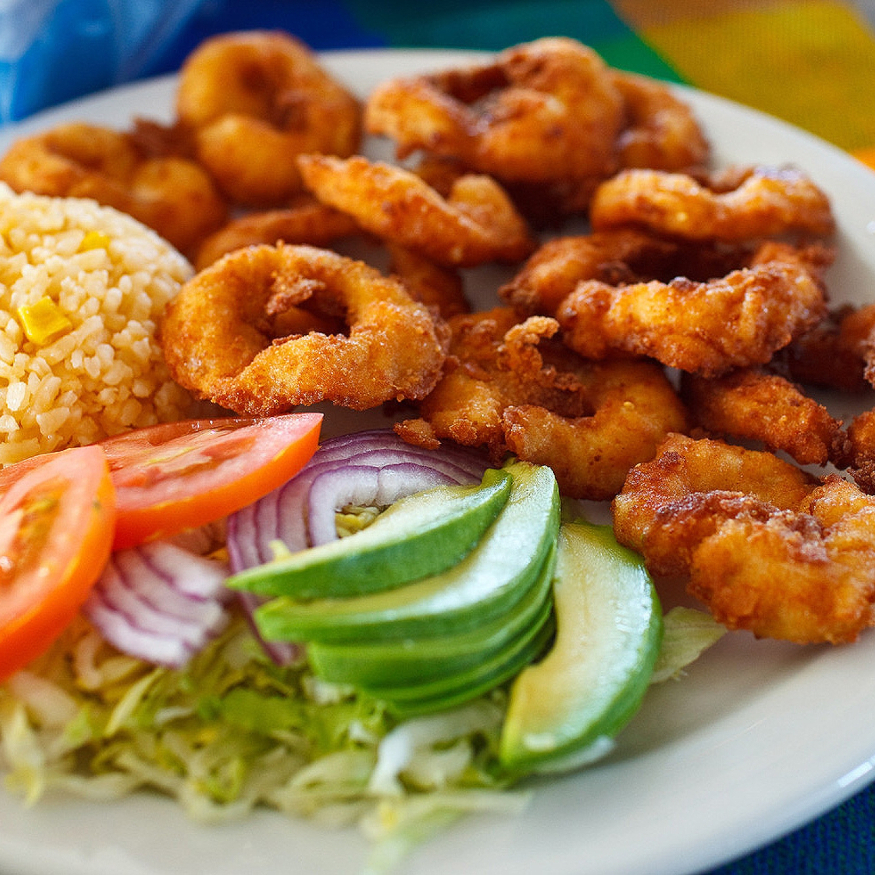 Riquísimos camarones empanizados acompañados de arroz, papas a la francesa, ensalada verde, salsa de la casa, totopos y limón.