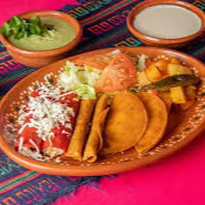 Prueba todo! Este plato esta formado por 2 enchiladas, 2 flautas y 2 tacos de deshebrada ¡no te quedes con las ganas de nada!. Acompañalo de ensalada y papas con zanahoria ¡Deliciosas!
