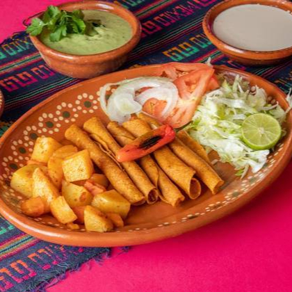 5 Piezas de Flautas, 100% carne de res casera, bañadas de un inigualable guacamole, ademas de su crema y salsa, acompañadas de ensalada y papas con zanahorias. ¡Deliciosas!
