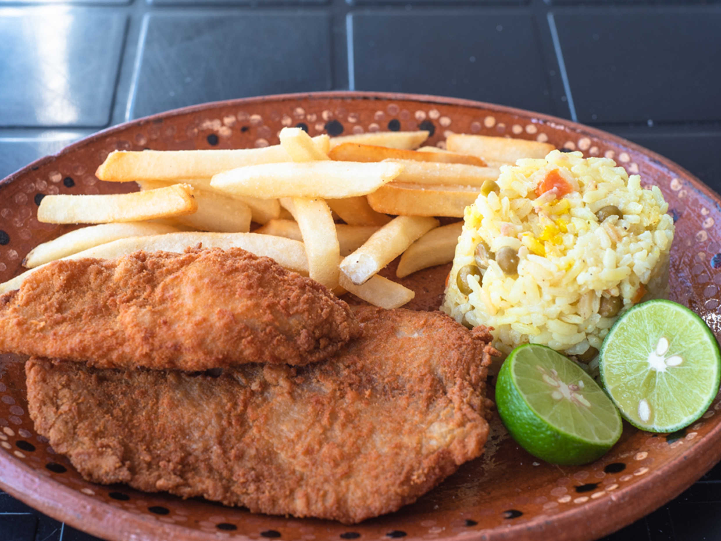 Filete empanizado con papas fritas,arroz y ensalada y una tostada de ceviche de pescado ,limones,salsa, saladitas, totopos y aderezo chipotle