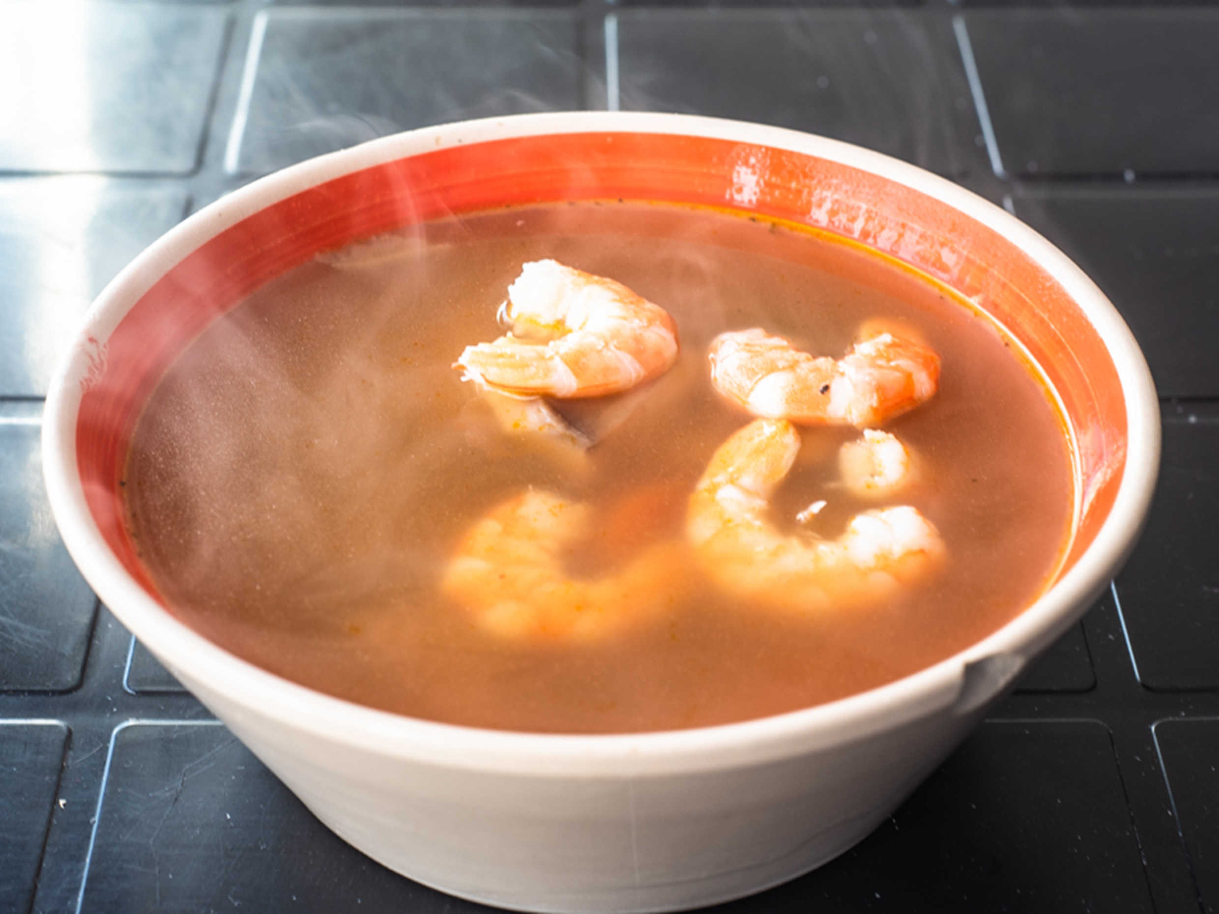 1 Litro de caldo de filete de pescado sin espina, camarones cilantro, arroz,topos,saladita,limón y salsa