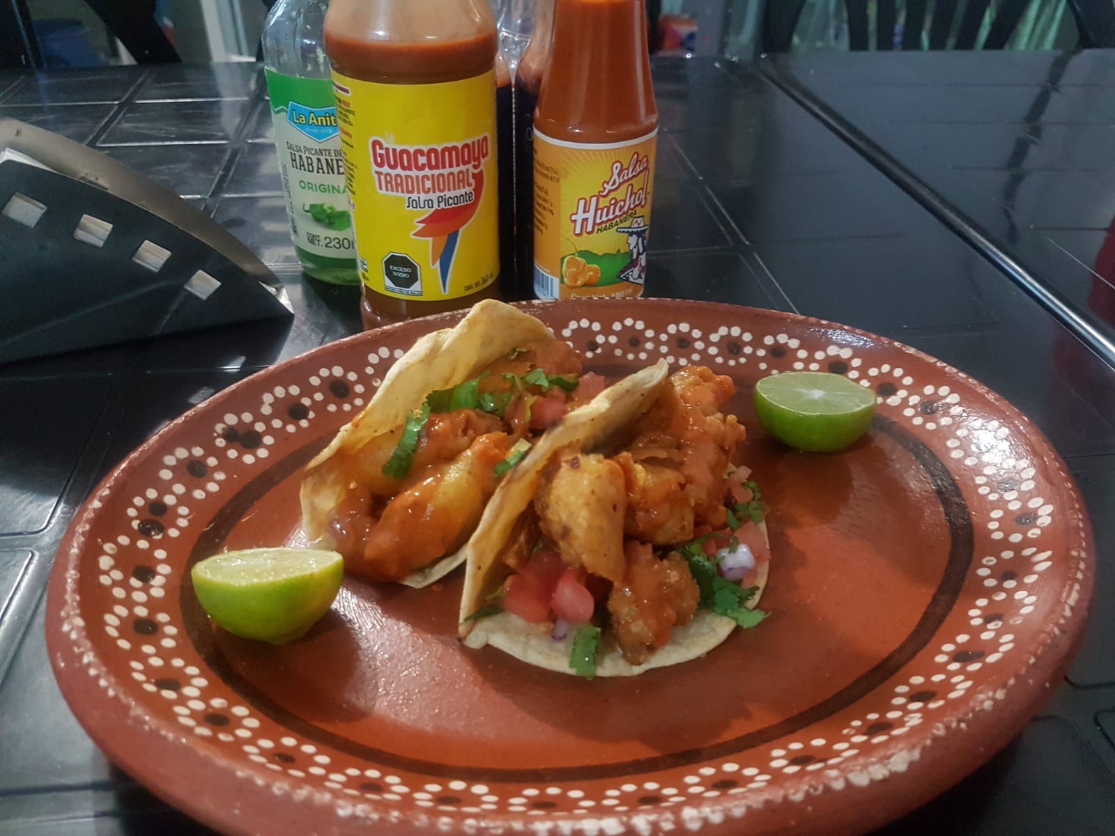 Tortilla de maíz doble, filete de pescado capeado, pico de gallo, aderezo chipotle, limón y salsa