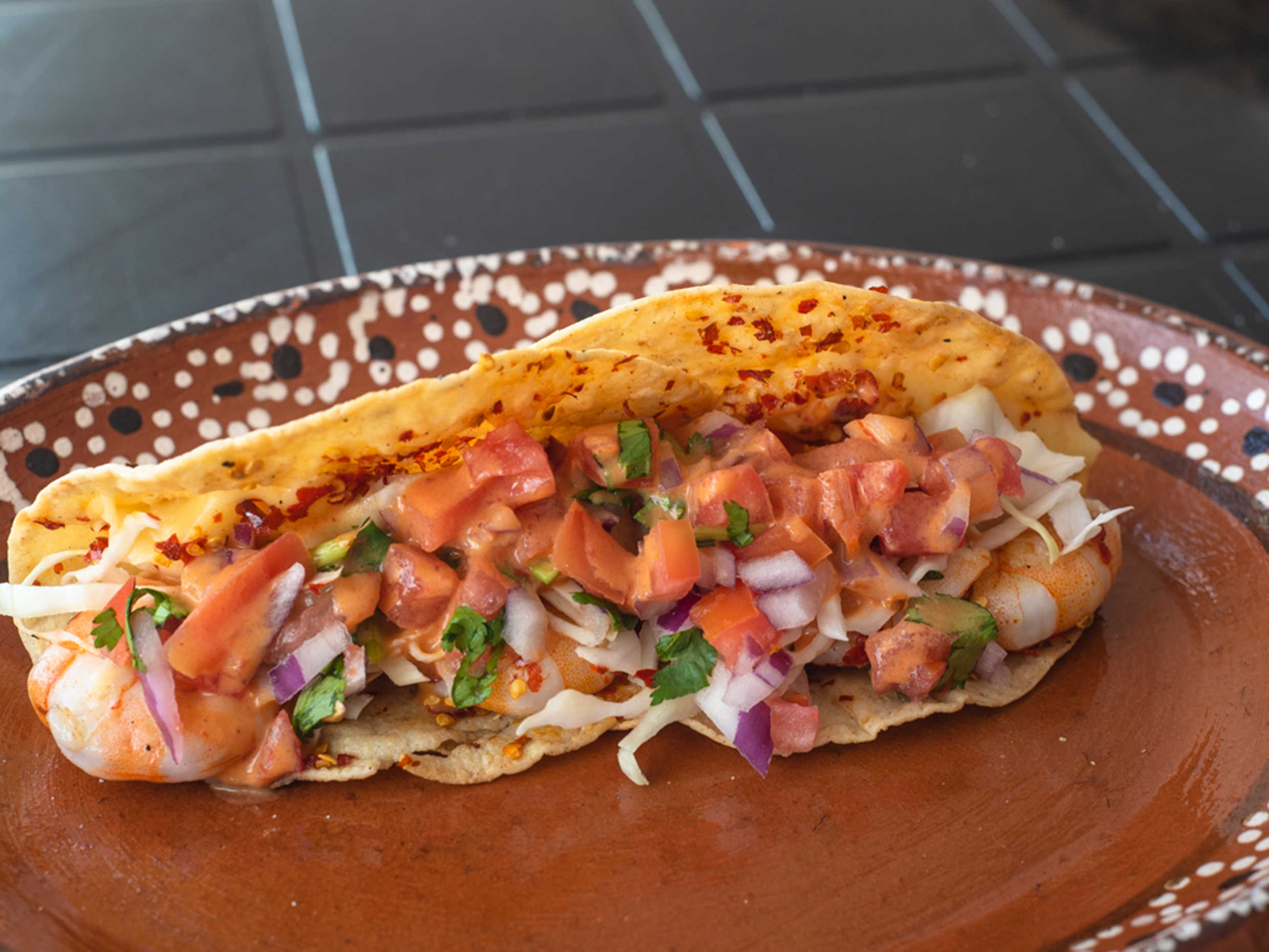 Quesadilla en tortilla doble de maíz con camaron doradito, chile de arbol, pico de gallo,aderezo chipotle, limón y salsa