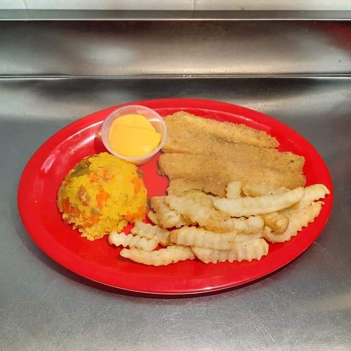 1 filete chico , 3 boneless buffalo, 3 camarones empanizados, 2 aros de cebolla, papas a la francesa, arroz y refresco 600ml