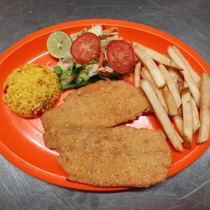 Filete y camarones empanizados. Incluye papas, arroz, aros de cebolla y ensalada.