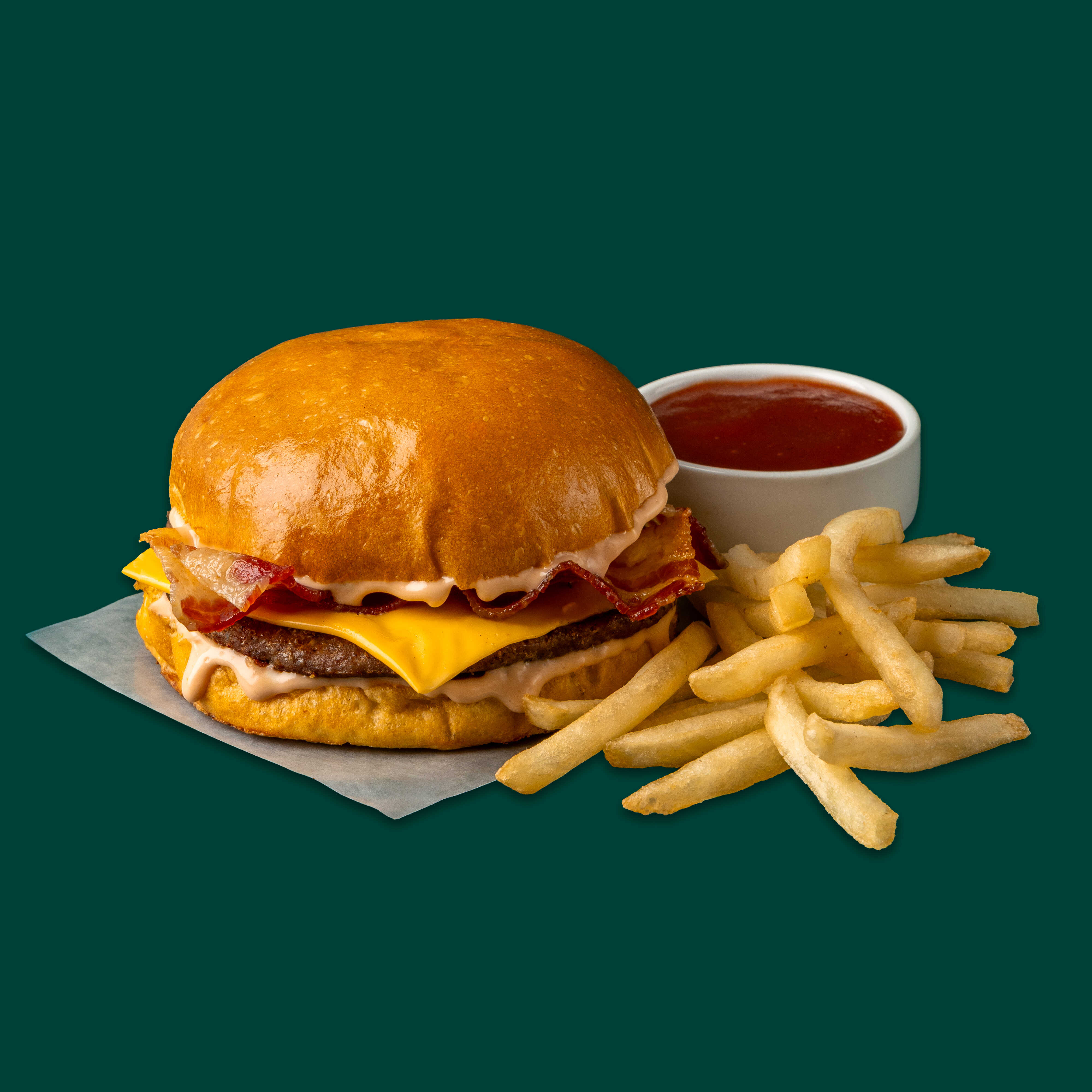 Combo: Hamburguesa con queso y tocino - Pan Brioche con un toque de mantequilla, Carne de res de 115 g (peso en crudo), aderezo clasico y queso americano, dos tiras de tocino.