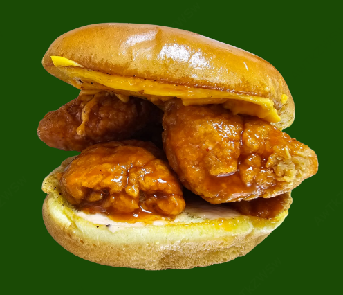 Hamburguesa de Pollo: Pan Brioche con un toque de mantequilla, Boneless de Pechuga de pollo natural, sazonada y bañada en salsa de tu preferencia, aderezo clásico y queso americano.