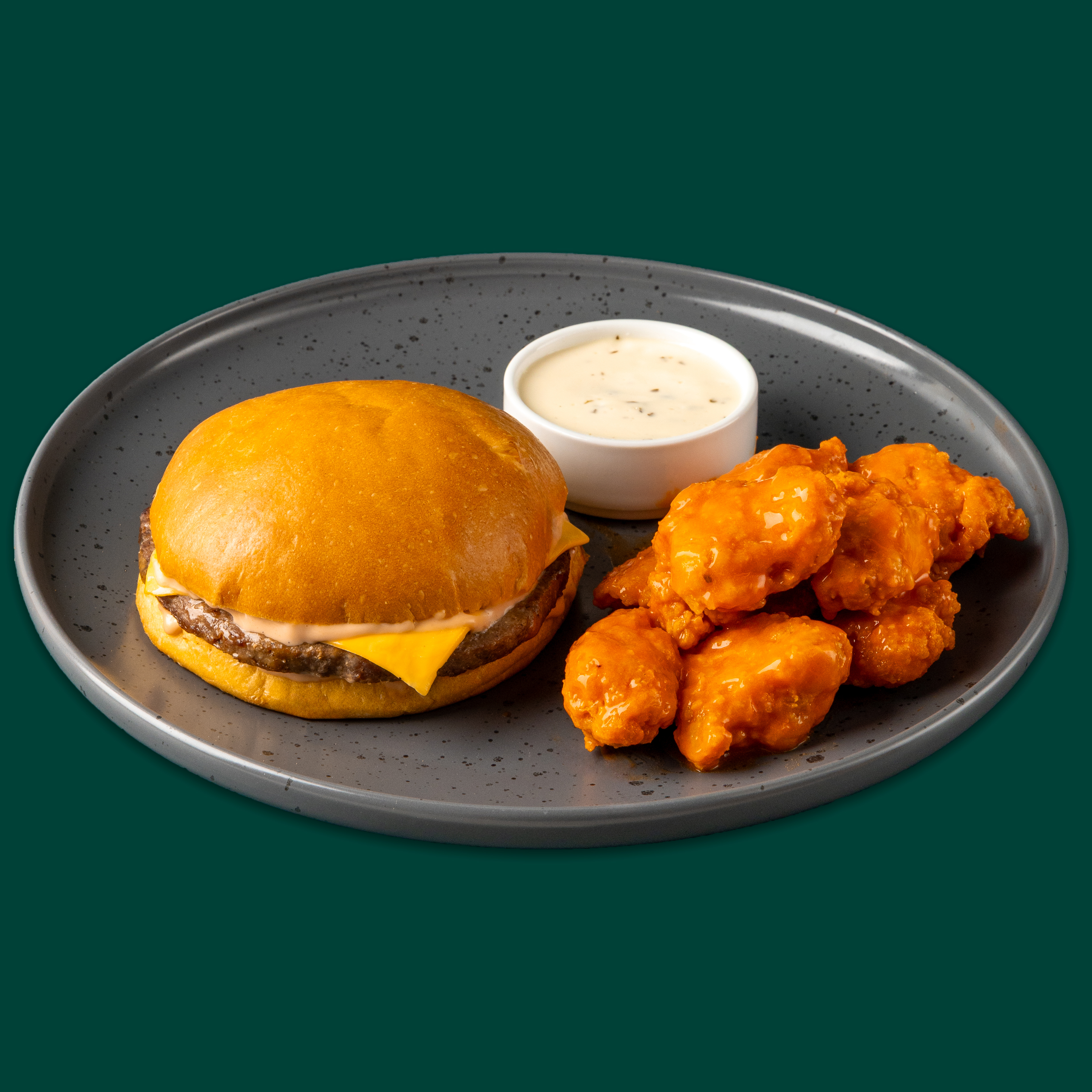 Combo de Hamburguesa con queso + Boneless 250 gr: Pan Brioche con un toque de mantequilla, Carne de res de 115 g (peso en crudo), aderezo clásico y queso americano. 250g de Pechuga de pollo natural, sazonada y bañada en salsa de tu preferencia, acompañada con un aderezo Ranch de 2 Oz.