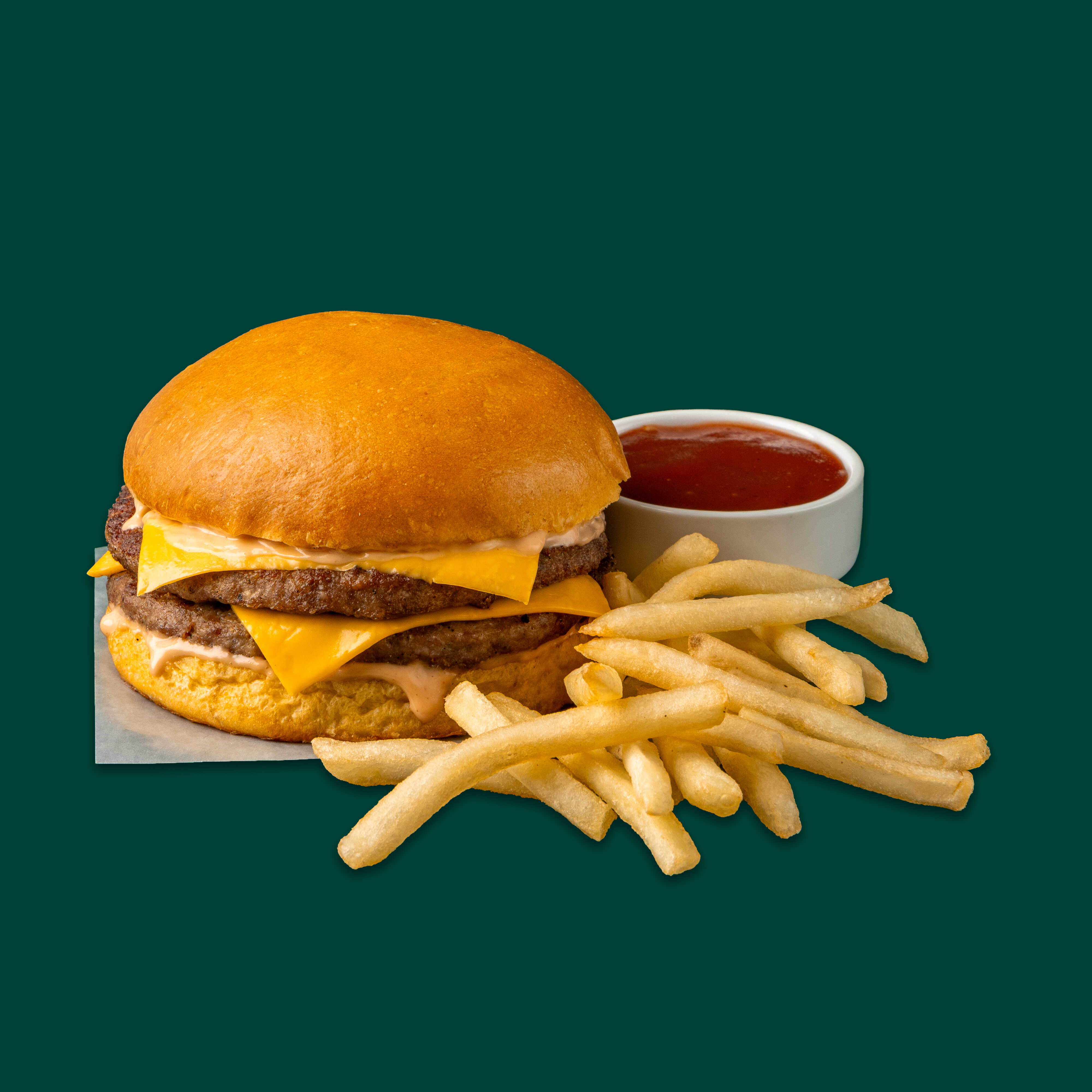 Hamburguesa doble con queso y tocino: Pan Brioche con un toque de mantequilla, dos carnes de res de 90 g (peso en crudo), aderezo clásico y doble porción de queso americano, cuatro tiras de tocino.