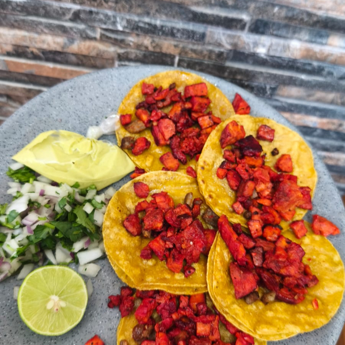 5 tacos de pastor, cebolla con cilantro, con cebolla morada,limon y salsa.
