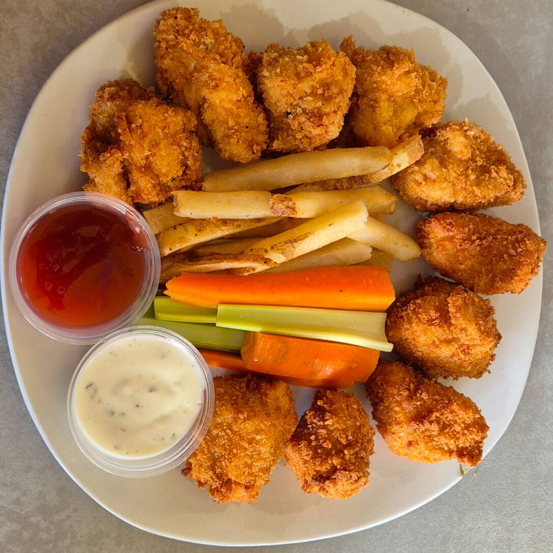 10 pz de cubos de pollo empanizado ,papas ,zanahoria,ranchero y kapsu