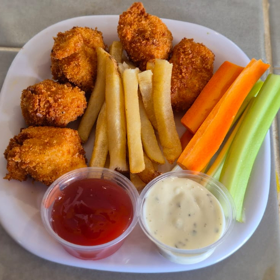 5 pz de pollo empanizado 100 gramos ,zanahoria,papas ,aderezo ranch y kapsu.