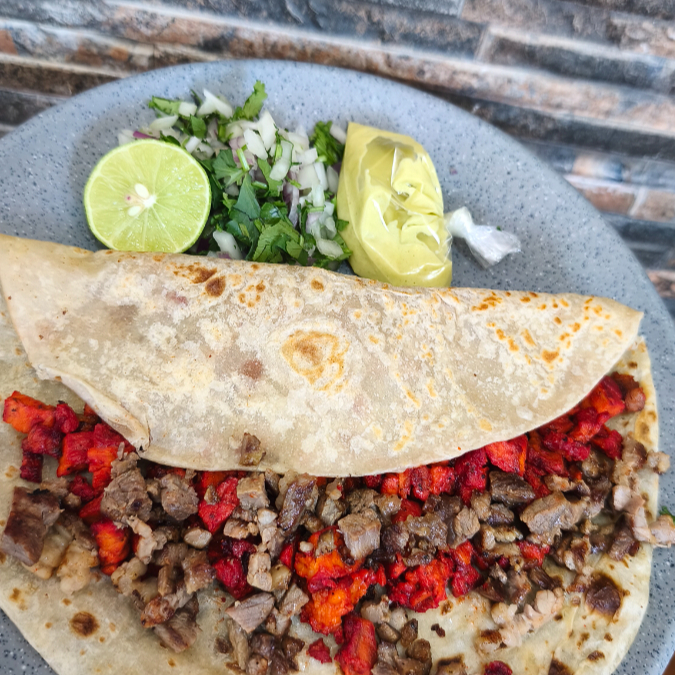 150 gramos de arrachera saltiada con pimiento verde ,cebolla morada ,queso manchego,aguacate,salsas ,papas y aderezos