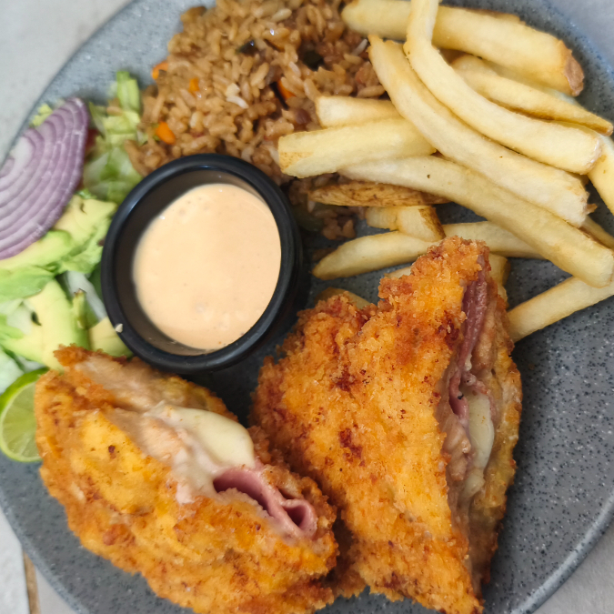 Pollo relleno de queso y jamón,acompañado arroz ,papas fritas, pan con ajo y salsa