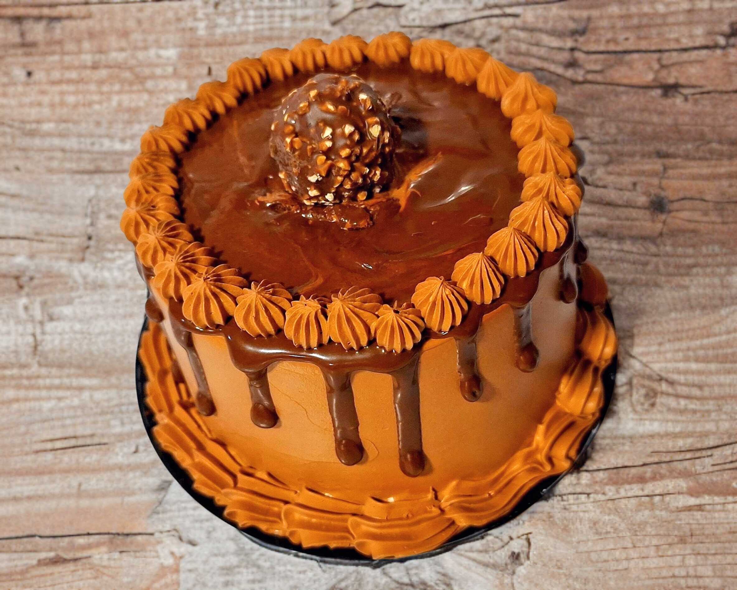 Elaborado pan chocolate, semihumedo, relleno de nutella, cubierto con betun de chocolate, decorado con nutella y ferrero
