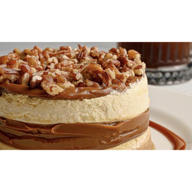 PAY DE QUESO CON GUARNICION DE FRUTOS ROJOS, DURAZNO, ALMENDRAS, NUEZ CARAMELIZADA Y SALSA DE CHOCOLATE BLANCO Y NUTELA