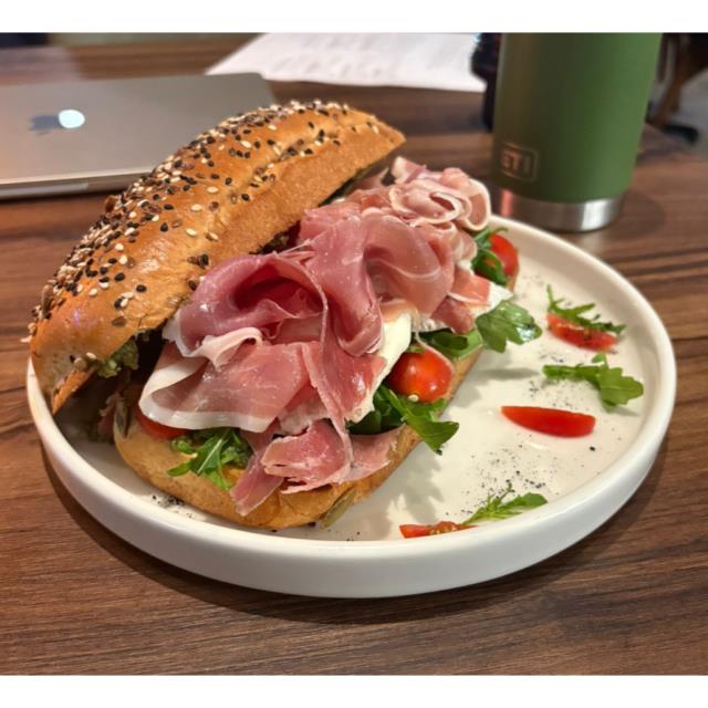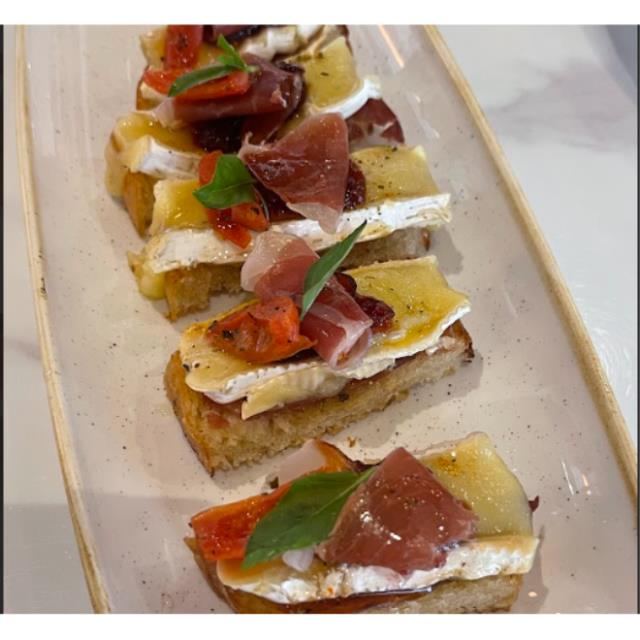 PAN DE MASA MADRE, PROSCIUTTO, QUESO BRIE, MERMELADA DE FRUTOS ROJOS.