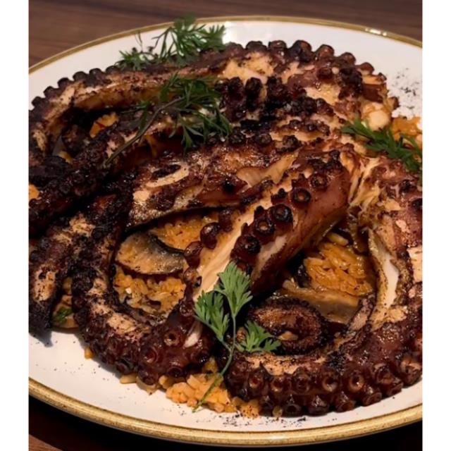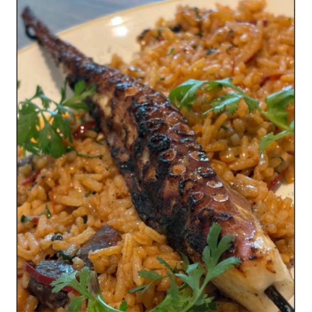 PULPO A LAS BRASAS, BAÑADO EN ADEREZO A BASE DE CHILES SECOS , MONTADO SOBRE ARROZ AL AJILLO