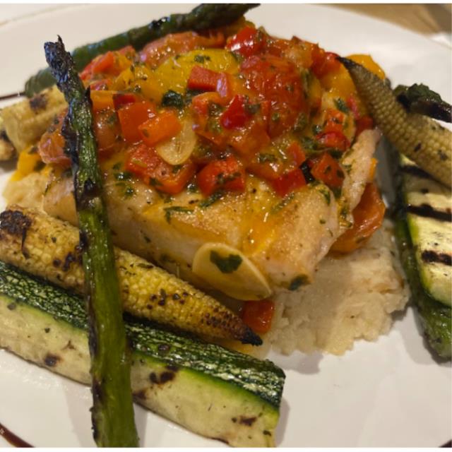 PESCADO BLANCO, BAÑADO EN SALSA DE VINO BLANCO, LIMON AMARILLO, TOMATE CHERRY, PIMIENTO ROJO Y AJO, MONTADO SOBRE PURE DE PAPA.
