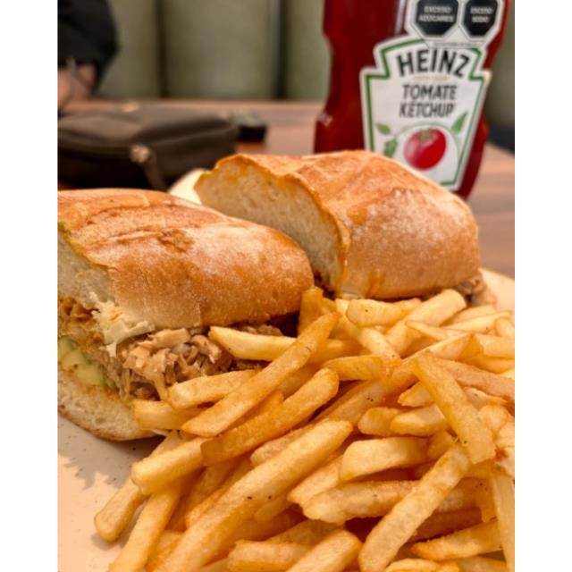 PAN TELERA, CARNITAS DE CERDO, AGUACATE, MAYONESA, ACOMPAÑADA DE SALSA VERDE Y PAPAS FRITAS.