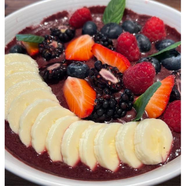 ACAI MEZCLADO CON MANTEQUILLA DE CACAHUATE:PLATANO, FRESA, ACOMPAÑADO DE FRUTOS ROJOS Y MIEL DE AGAVE.