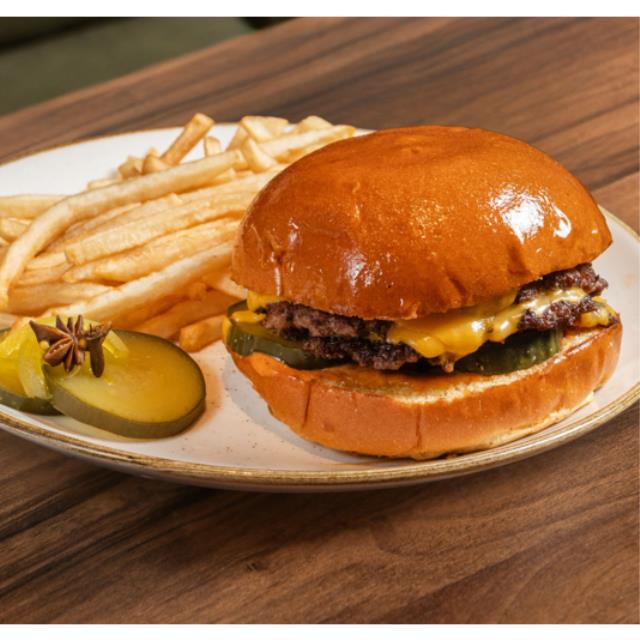 SMASH BURGER CON DOS CARNES DE RES DE WAGYU AMERICANO, QUESO AMERICANO, ADEREZO, PEPINILLOS Y PAPAS A LA FRANCESA.