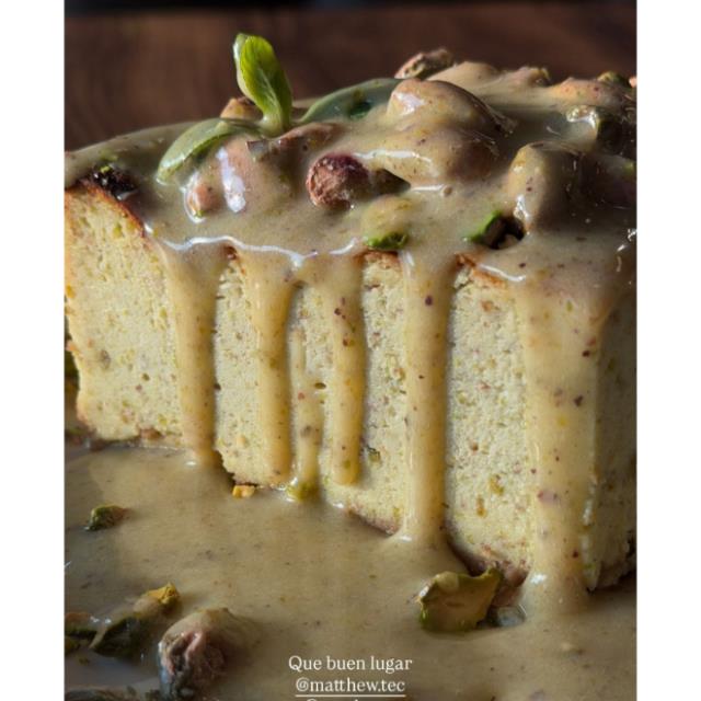 PAY DE QUESO CON PISTACHE Y SALSA DE PISTACHE.
