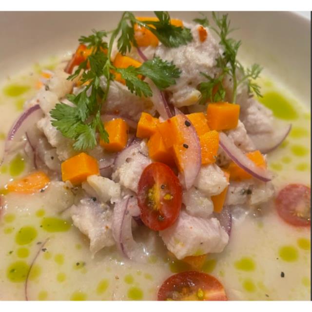 FILETE DE ROBALO FRESCO, MAIZ,CAMOTE,CEBOLLA MORADA Y TOMATE CHERRY BAÑADOS EN LECHE DE TIGRE PERUANA.