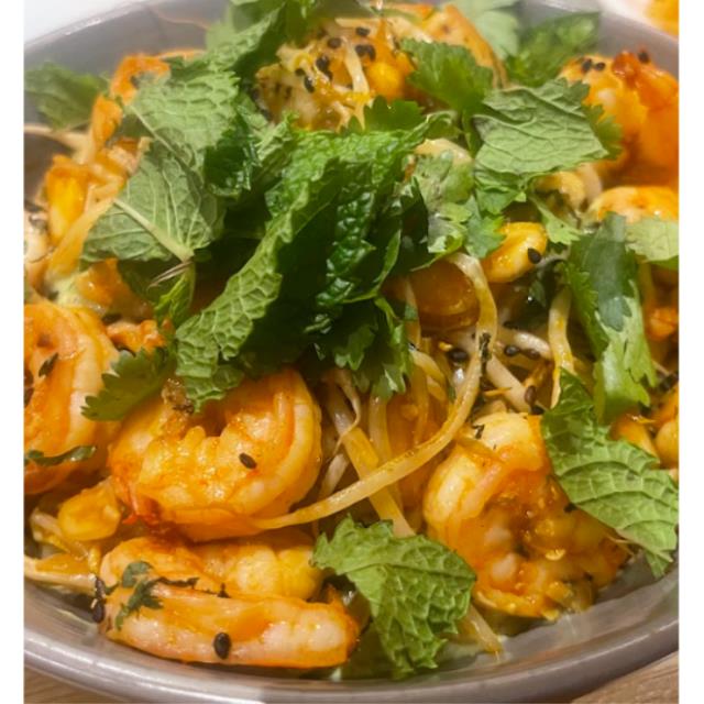 ARROZ BLANCO AL CILANTRO, CAMARONES SALTEADOS CON ACEITE DE CHILES RAJU Y GERMINADO DE SOYA, CACAHUATE, MENTA Y CILANTRO
