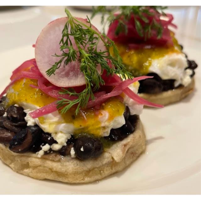 DOS HUEVOS POCHADOS MONTADOS SOBRE GORDITAS DE MAIZ CON ASIENTOS DE PUERCO,FRIJOL NEGRO, QUESO PANELA BAÑADOS EN SALSA VERDE, CHICHARRON DE LA RAMOS