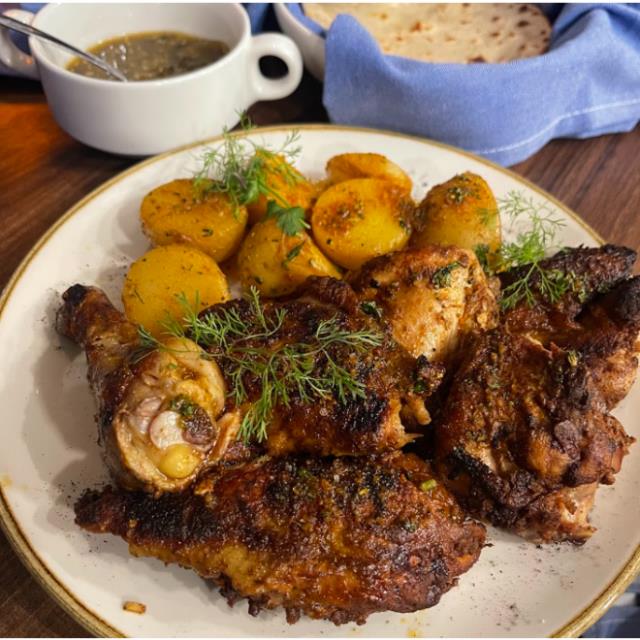 POLLO ENTERO ASADO AL HORNO , SAZONADO CON ESPECIAS Y PAPRIKA. ACOMPAÑADO DE PAPAS SALTEADAS.