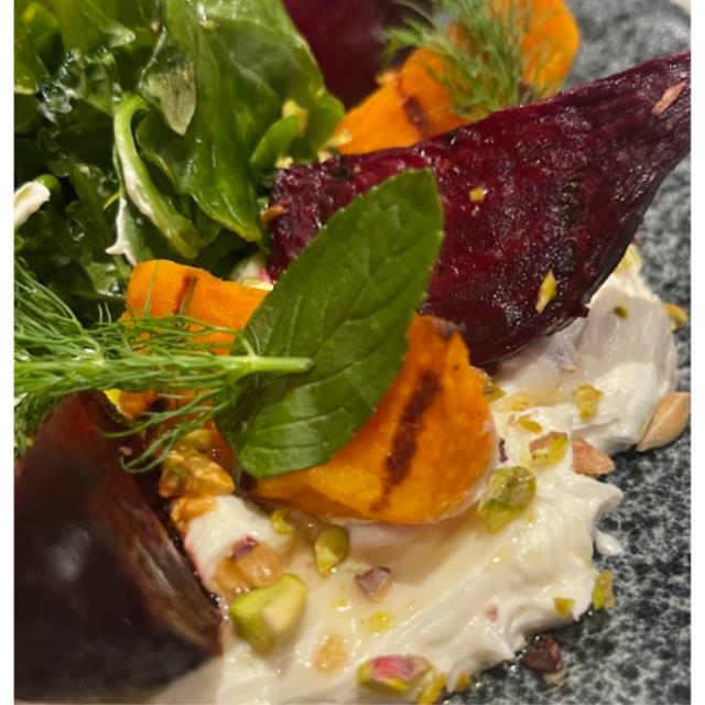 BETABEL Y CAMOTE ASADOS, SOBRE DIP DE QUESO DE CABRA, ARUGULA, PISTACHE Y VINAGRE BALSAMICO