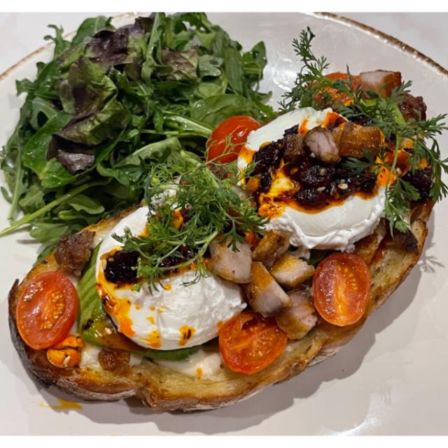 PAN DE MASA MADRE, AGUACATE, ADEREZO DE AJO ROSTIZADO, 2 HUEVOS POCHE, CHICHARRON Y ENSALADA.