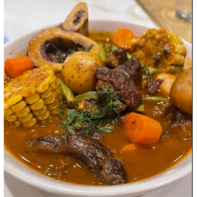 ESTOFADO DE CARNE DE RES COCIDO 18 HORAS, VEGELES, ACOMPAÑADO DE FRIJOL NEGRO Y ARROZ BLANCO.