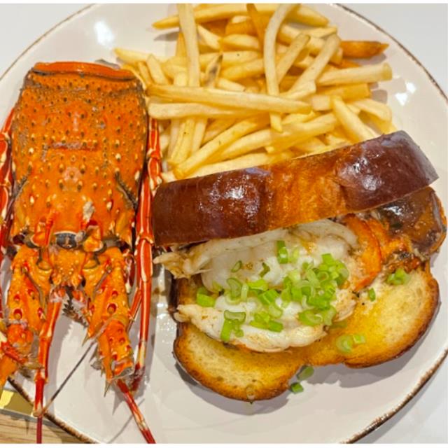 PAN BRIOCHE, LANGOSTA NACIONAL ENTERA, MANTEQUILLA Y ADEREZO DE LIMON. ACOMPAÑADO DE PAPAS A LA FRANCESA.