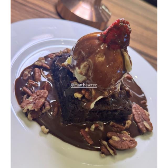 BROWNIE DE CHOCOLATE, HELADO DE VAINILLA Y SALSA DE CHOCOLATE