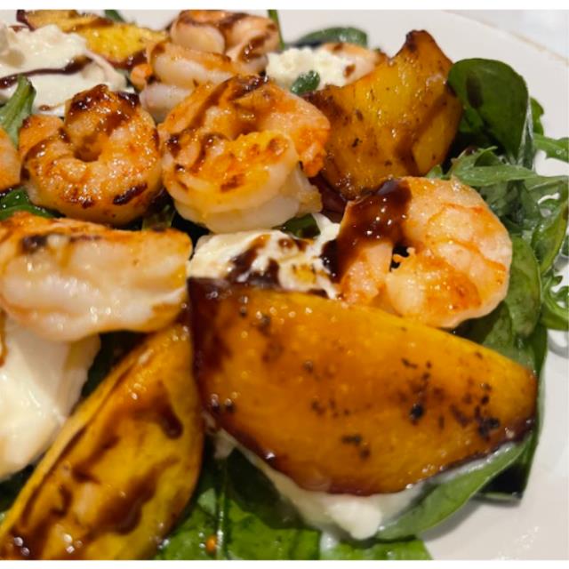 MIX DE ESPINACA Y ARUGULA, DURAZNO, BURRATA Y CAMARON SALTEADO.