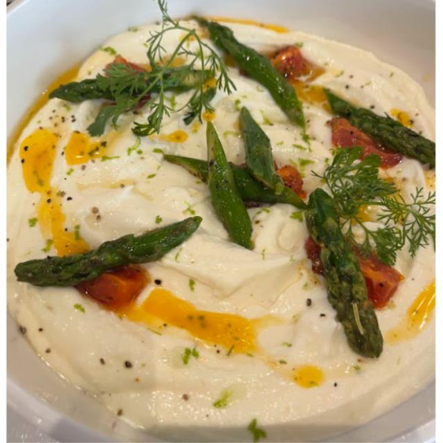 DIP DE QUESO RICOTA CON LIMON AMARILLO, CORAZON DE ALCACHOFA, ESPARRGOS, TOMATE CHERRY, ACOMPAÑADO CON PAN DE MASA MADRE