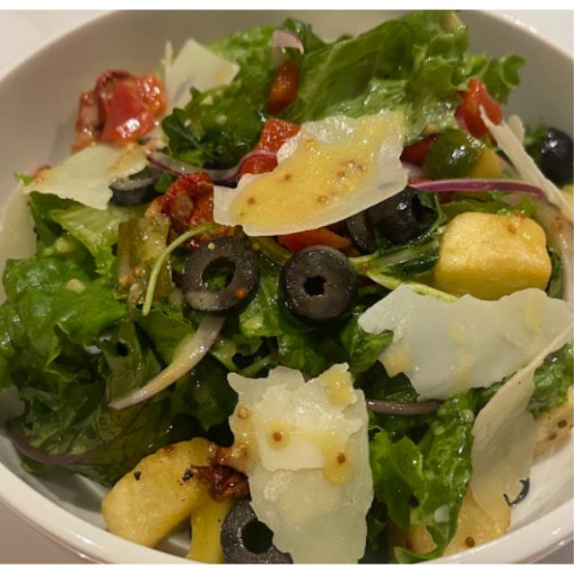 MIX DE LECHUGAS, ACEITUNA, PAPA FRITA, TOMATE DESHIDRATADO, PEPINO, CEBOLLA MORADA, QUESO PARMESANO Y ADEREZO DE MOSTAZA