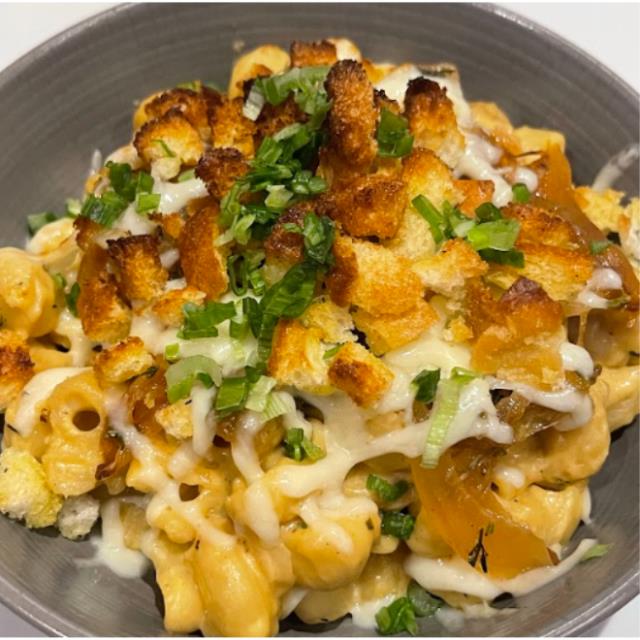 MACARRON CON CREMA DE QUESOS, CEBOLLA CARAMELIZADA Y CROTONES. SABOR A FRENCH ONION SOUP.