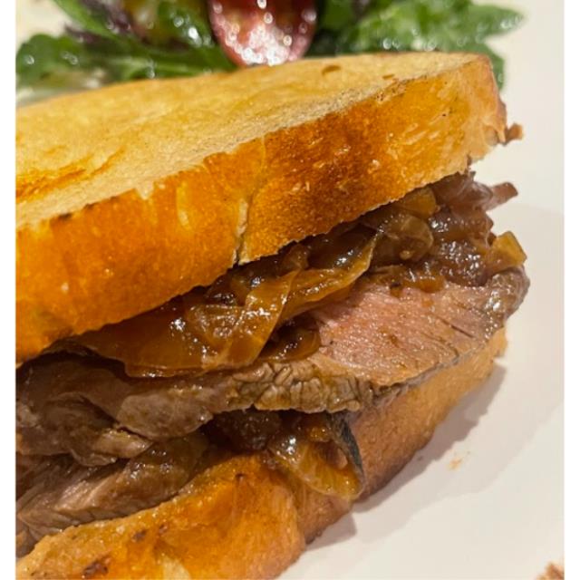 PAN DE MASA MADRE, FILETE DE RES, QUESO BRIE GRATINADO, CEBOLLA CARAMELIZADA, ACOMPAÑADO DE ENSALADA Y JUGO DE CARNE