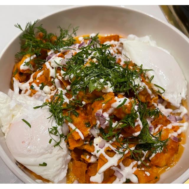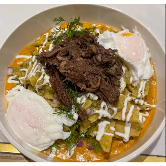 MONTADOS SOBRE FRIJOLES PUERCOS, QUESO FRESCO, CREMA ACIDA, CEBOLLA MORADA Y CILANTRO. ACOMPAÑADOPS DE 2 HUEVOS POCHE.