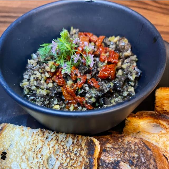 MEZCLA DE ACEITUNA, ACEITE DE OLIVO, PEREJIL,AJO Y OJUELA DE CHILE, ACOMPAÑADO DE PAN DE MASA MADRE.