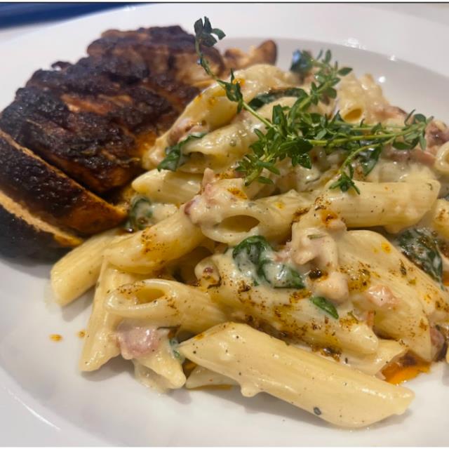 PASTA EN SALSA BLANCA A BASE DE PARMESANO Y TOCINO, PECHUGA DE POLLO, ACOMPAÑADA DE PAN.