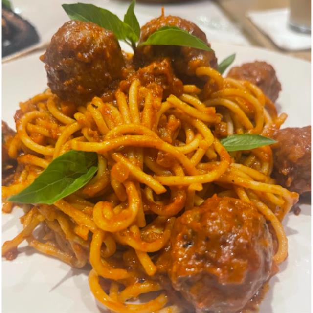 PASTA CON ALBONDIGAS Y SALSA BOLOÑESA, ALBAHACA Y QUESO PARMESANO RAYADO