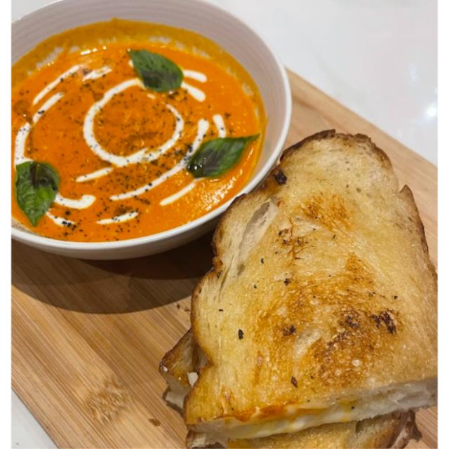CREMA DE TOMATE ROSTIZADO ACOMPAÑADA DE SANDWICH DE QUESO.