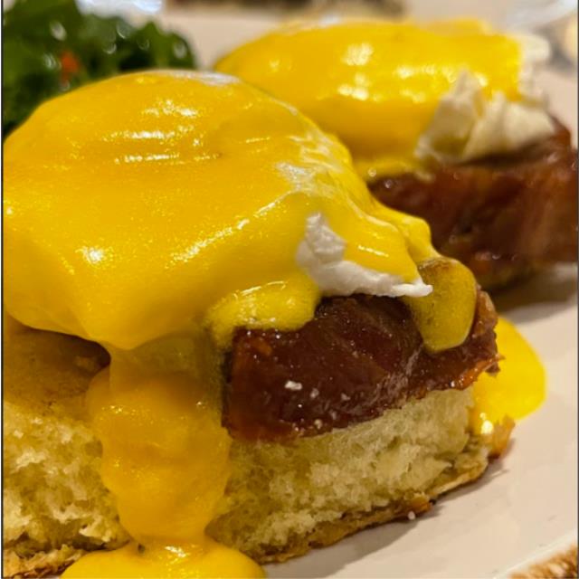 DOS HUEVOS POCHADOS MONTADOS SOBRE PAN BRIOCHE, PANCETA DE CERDO GLASEADA, BAÑADOPS EN SLASA HOLANDESA. ENSALADA FRESCA.