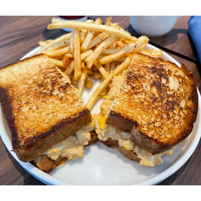 PAN BRIOCHE, ENSALADA DE: HUEVO COCIDO, MAYOMORITA, CREMA. ACOMPAÑADO DE PAPAS FRITAS.