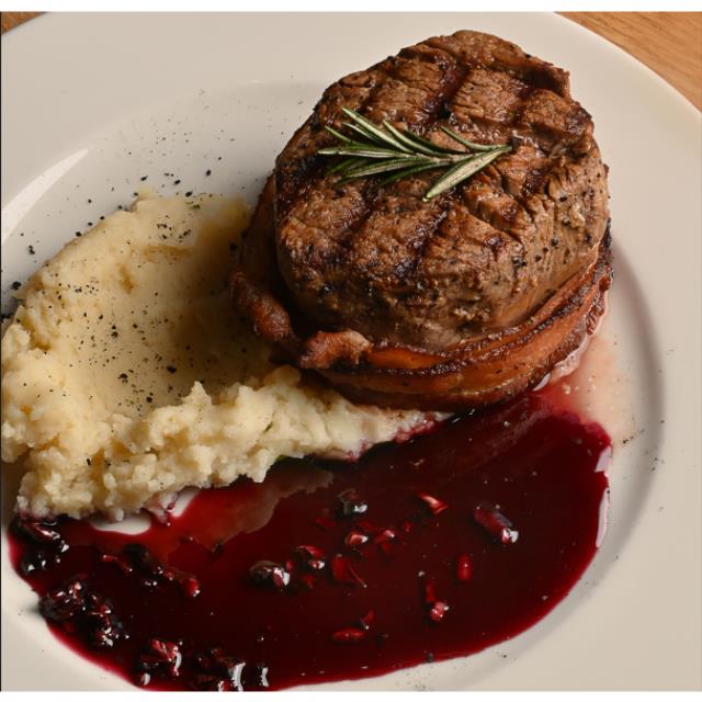 FILETE DE RES ENVUELTO EN TOCINO, SOBRE PURE DE PAPA Y REDUCCION DE VINO TINTO.